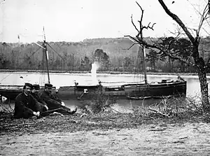 ![]() USS Kansas on the James River, Virginia, circa February–April 1865. Note her white smokestack, and three officers seated on shore. | |
