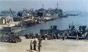 ![]() LST-374, starboard of LST-376, loads a DUKW amphibious truck at an unidentified English port prior to the Invasion of Normandy | |