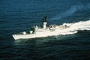 The Knox-class ships were armed with a 5"/54 caliber Mark 42 gun forward and a single 3-inch/50-caliber gun aft. They mounted an eight-round RUR-5 ASROC launcher between the 5-inch (127 mm) gun and the bridge. Close-range anti-submarine defense was provided by two twin 12.75-inch (324 mm) Mk 32 torpedo tubes. The ships were equipped with a torpedo-carrying DASH drone helicopter; its telescoping hangar and landing pad were positioned amidships aft of the mack. Beginning in the 1970s, the DASH was replaced by a SH-2 Seasprite LAMPS I helicopter and the hangar and landing deck were accordingly enlarged. Most ships also had the 3-inch (76 mm) gun replaced by an eight-cell BPDMS missile launcher in the early 1970s.[4]
