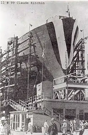 SS Claude B. Kitchin on the building ways at J. A. Jones Construction Co. Inc., Panama City, FL., prior to launching, 24 May 1945.