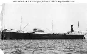 ![]() A damaged photograph of SS Los Angeles in 1916 or 1917, prior to its U.S. Navy service. | |