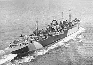 ![]() USS Menkar (AK-123) underway, date and location unknown. Note dazzle camouflage scheme. | |