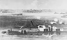 The first USS Milwaukee, a double-turreted Milwaukee-class river monitor, the lead ship of her class, built for the Union Navy during the American Civil War. The ship supported Union forces during the Mobile Campaign as they attacked Confederate fortifications defending the city of Mobile, Alabama in early 1865. She struck a mine in March and sank without loss. Her wreck was raised in 1868 and broken up for scrap that was used in the construction of a bridge in St. Louis, Missouri.