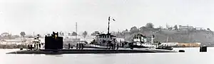 ![]() USS Pollack (SSN-603) receives assistance from U.S. Navy tug USS Skenandoa (YTB-835) (center rear) while arriving off Mare Island Naval Shipyard, Vallejo, California, in January 1988 for inactivation. | |