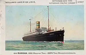 USS Rijndam (ID–2505) was the Holland America Line (HAL) ocean liner Rijndam, also spelt Ryndam, which was launched in Ireland in 1901 and scrapped in the Netherlands in 1929. The US requisitioned her as the United States Navy troopship USS Rijndam from 1918 until 1919. She was the first of four Holland America Line ships to be called Ryndam.