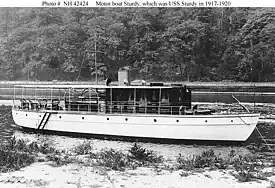 The first USS Sturdy (SP-82) was a patrol boat acquired by the U.S. Navy for the task of patrolling the coastal waters of the U.S. East Coast during World War I. Her primary task was to guard the coastal area against German submarines by tending to antisubmarine nets in New York harbor.
