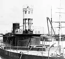 Agamenticus was named after Mount Agamenticus in York County, Maine.[5] The monitor was laid down in 1862 at the Portsmouth Navy Yard in Kittery, Maine and launched on 19 March 1863.[7] To speed her construction, her hull was built from green wood.[8] While still building in early 1864, she was modified with the addition of a turret-roof-height "hurricane deck" that stretched between the two turrets and around the funnel and main ventilator to improve her navigational facilities.[7] Agamenticus was commissioned on 5 May 1865 and was prepared to fight the Confederate ironclad CSS Stonewall that was at sea somewhere in the Atlantic Ocean at that time. Stonewall went elsewhere[1] and the monitor operated off the northeastern coast of the United States until she was decommissioned at the Boston Navy Yard on 30 September. Agamenticus remained laid up for nearly five years and was renamed Terror on 15 June 1869.[7]