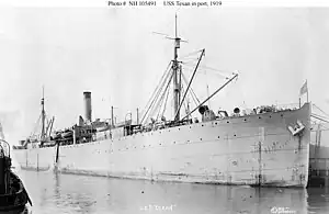 Assigned to the Naval Overseas Transportation Service after being refitted for naval service, Texan loaded general military supplies and departed on 9 April 1918 in a convoy for France. Texan arrived at Brest, France, on 24 April 1918 and, after discharging her cargo, began the return voyage to New York on 19 May 1918. Upon her arrival there, she underwent voyage repairs and then loaded supplies, including 405 tons of ammunition and 10 locomotives destined for Marseilles, France. Texan departed with a convoy on 18 June 1918 and arrived at Marseilles on 7 July 1918. Texan made another round-trip voyage to Marseilles in September 1918. On 23 October 1918 she sank the American sail Barge J. H. Rutter in a collision in the North River.[1][2] She made another round trip to Le Verdon-sur-Mer, France, in November and December 1918 before returning to New York on 4 January 1919.