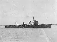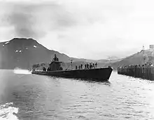 Triton's fourth war patrol took her to Alaskan waters and lasted from 25 June to 24 August. On 4 July, she was patrolling in a heavy fog, in the vicinity of Cape Sabok, when the fog lifted enough to reveal a Japanese destroyer. The submarine trailed the enemy for ten hours,[25] in and out of patches of fog, until she had closed the range to 3,000 yards (2,700 m). Triton then launched two torpedoes, and one hit amidships. The Japanese destroyer Nenohi {right} (1,370 tons)[26] capsized to port and slid under the waves in five minutes.[25] Triton sighted a freighter on 28 July, but lost it in a fog bank. The same thing happened the next day. On 9 August, Triton saw an enemy submarine's periscope and prepared to attack. However, the Japanese sub struck first, forcing Triton to go deep as enemy torpedoes passed overhead. On 15 August, Triton launched four torpedoes at a darkened ship from a range of 1,500 yards (1,400 m). There were two consecutive explosions, and flames shot over 200 feet (60 m) into the air. To Triton, the enemy ship appeared to be larger than a destroyer. However, there is no official record of a sinking on that date.[27] The submarine made no further contacts before returning to Pearl Harbor on 7 September, and was credited with two ships for 3,100 tons (postwar, only Nenohi, at 1,600 tons).[28] She then entered Pearl Harbor Navy Yard for an overhaul until 6 December.