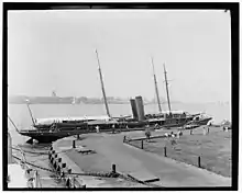 ![]() USS Vixen, photographed in 1898, with sails hoisted on both masts. | |