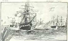 ![]() Wash drawing in grey tones by Clary Ray, circa 1900, showing USS Wabash under steam and sail | |