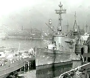 Wateree herself, however, fell victim to typhoon "Louise" when it hit the anchorage on 9 October.[1] At about 12:20, her starboard anchor was carried away by one of the many ships and barges cast about by the storm. To ease the strain on her remaining port anchor chain, she started her engines. Soon, however, she had to weigh anchor to avoid all the vessels adrift in the anchorage. The wind blew her afoul the anchor buoy for APL-28, and she was drawn in toward that ship.