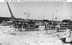 ![]() USS Wemootah in an [icy port with several other section patrol craft sometime between 1917 and 1919, probably in the New York Harbor area. | |