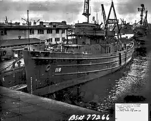 The ship was built at the United Engineering Co. at Alameda, California. She was laid down on 12 January 1944 and launched on 7 September 1944. The ship was commissioned on 24 March 1945. She was re-designated as ATF-118 on 15 May 1944.[2]