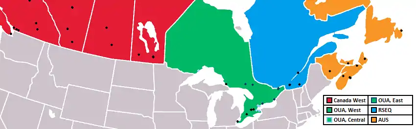 As of the 2022–2023 U Sports season, 48 of the 56 U Sports member institutions have men's basketball teams. The teams are split into four conferences with some conferences splitting teams further into divisions. With the addition of Ontario Tech for the 2019–20 season, the OUA moved to three six-team divisions.[3] The Canada West conference had two divisions, but reverted to a one conference format for the 2016–17 season with 17 teams.[4] The AUS conference has eight teams while the RSEQ conference has five.