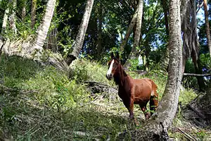 Because of the sparse vegetation, there are only a few species of native land animals on Ua Huka, mainly insects, lizards, land birds and spiders including a genus of spiders endemic to the Marquesas named after this island itself belonging to the canopy spider family (Linyphiidae). The large number of feral goats and horses that graze freely there contribute to scrub deforestation. Horses were brought from Chile to Ua Huka by Admiral du Petit-Thouars in 1842,[5] it has gained a reputation ever since as the "horse island" where it is said that there are more horses than people on the island numbering around 3,000.[6][7]
