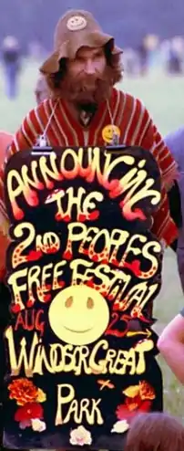 Inspired by his experiences during the "liberation" of the Isle of Wight Festival 1970, in which the fences between the paid event and free gathering outside were torn down, Dwyer developed the idea of a truly "free" festival. An acid trip in Windsor Great Park led to the notion of squatting on the former common land that had been in Crown ownership since being reserved for royal hunting by William the Conqueror, and he began to organise what was to become the People's Free Festival.[7] Windsor Free Festival was the forerunner of, and inspiration for, the Free Festival Movement, particularly the Stonehenge Free Festival and the later Glastonbury Festivals. Following the violent suppression of the 1974 event, he and Sid Rawle were imprisoned to prevent the organising of a 1975 festival.[8] Dwyer was imprisoned again attempting to organise another Windsor Free Festival in 1978, which did take place at Caesar's Camp nearby.[9]