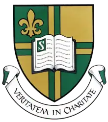 Université de Sherbrooke's arms, supporters, flag, and badge were registered with the Canadian Heraldic Authority on January 15, 2004.[4] Université de Sherbrooke's crest and Supporters were registered with the Canadian Heraldic Authority on April 20, 2007.[5] The motto of the school is Veritatem in Charitate ("Truth through charity").