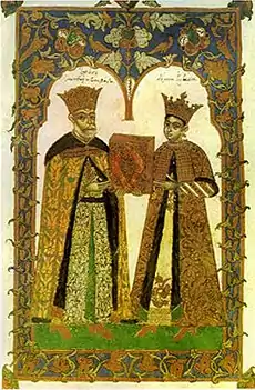 Despite its claim to have originated in Roman Dacia[2] and its alleged links to the Fogoras nobility,[3] the Năsturel clan was first attested as belonging to boyardom in the late 15th century. A period document by "Vlad Vodă", brother of Radu the Great, confirms that, by 1501, the Năsturels were long established as the owners of Herăști (traditionally in Ilfov County,[4] now in Giurgiu) and other Wallachian villages. The same document suggests that Vrăjoghie, the family patriarch, was "of My Highness' own house", namely the House of Basarab.[4] A 19th-century author, Dimitrie Papazoglu, also argued that the family had a deep connection to the village, and later capital city, of Bucharest, suggesting that they were the builders of an ancient church in Dobroteasa mahala. He also proposed that Herăști took its name from a family patriarch, "Count" Herea Năsturel.[5] The genealogical link with the ruling princes was in any case enhanced ca. 1600, when Udriște's father, the Postelnic and Logothete Radu Năsturel, married Despina, a cousin or niece of Michael the Brave. According to researcher Constantin Gane, Despina, known as Cala in some sources,[6] may have been the daughter of boyar Radu Calomfirescu.[7]
