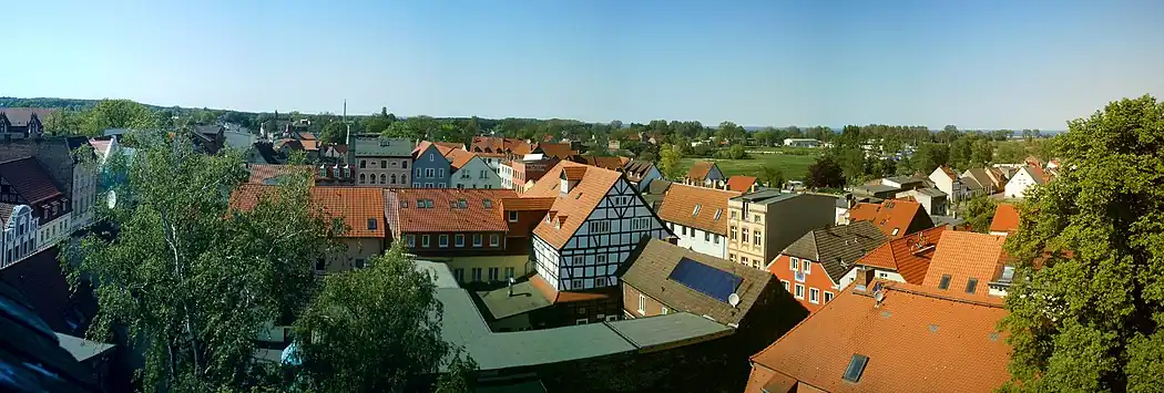 The surrounding area, even when seen from the odd spot that reaches 20 m above sea level, is almost flat. The city also gave the Ueckermünder Heide (heath and woodland) its name. It is Western Pomerania's biggest wooded area, and stretches from the northwest to the southeast over 50 km to the Polish town of Police (Pölitz in German).