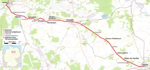 The existing two-track section for crossing and overhauling between Brunau-Packebusch and Rademin, which is around 17.5 kilometre long, is to be extended to the east and west. This applies to the sections between Hohenwulsch and Brunaupark-Packebusch and between Rademin and Salzwedel. This involves a total of 22 km of additional second track at an estimated cost of about €57 million. The reason given for the project is to increase the capacity for freight and to improve the performance of regional traffic.[4] In July 2013, Deutsche Bahn put the project out to tender.[5] The estimated value of the contract, including overhead electrification, is €22 million, which is to be carried out between June 2014 and March 2016.[6]