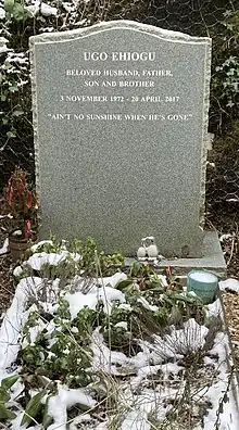 On 20 April 2017, Ehiogu collapsed due to a cardiac arrest at the Tottenham Hotspur training ground and was taken to hospital,[49] where he died early the next morning at the age of 44.[46][49] In the aftermath, it was announced that Ehiogu's widow Gemma would set up a charity in his honour. She used social media site JustGiving with the aim of raising £1,000 to start the charity. By 24 April, the appeal had raised £11,000.[50] In the days following Ehiogu's death, many clubs held tributes to him in the form of a minute's applause before matches, in which players wore black armbands.[51] He is buried in Highgate Cemetery.