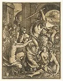 Over the years Ugo reproduced designs by numerous artists, including Raphael, Baldassare Peruzzi, and Parmigianino.[2] According to Vasari, Ugo da Carpi even taught the print-making process to Parmigianino.[10] The majority of Ugo's carvings are copies or reproductions of other works.[8] Although Ugo's works are interpretations and not exact copies, it is unlikely that Ugo invented the design for many of his woodcuts.[8] In all surviving prints and inscriptions, Ugo has signed the work as "the cutter" or "the printer," speaking to his focus on copying other works.[8] However, this was not uncommon, since replicating other artistis' work was the focus of the engraving and printing communities at this time.[8]