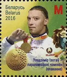 Uladzimir Izotau (born 6 September 1988) is a Belarusian para swimmer who specialises in the breaststroke.[1] At the Rio 2016 Paralympic Games, he won the gold medal in the men’s 100m breaststroke SB12 final.[2] The games were commemorated on postage stamps all over the world. Izotau represented Belarus.[3]