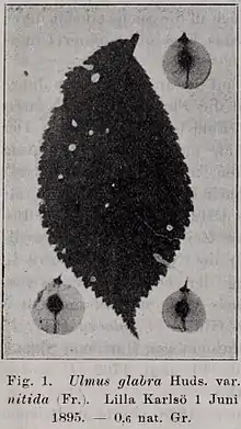 Krüssmann described f. nitida as having "leaves smooth above" and glabrous young shoots.[8][12] An 1895 herbarium specimen from Lilla Karlsö shows a typical wych leaf with a short petiole, and a samara with seed on stalk side of centre, a feature of unhybridised wych.