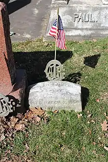 After the public display of his corpse, Dahlgren was interred in an unmarked grave at Oakwood Cemetery in Richmond.[18] His father petitioned to have Ulric's body returned for burial in Philadelphia. He made four trips to Fort Monroe to try to arrange an agreement and even contacted the Confederate Commissioner of Exchange to formally request the return of Ulric's remains.[23] The Union spy Elizabeth Van Lew used her connections in Richmond to secretly exhume his remains and reinter them at a farm 10 miles outside of Richmond[24] to prevent further desecration of his body.[18] Dahlgren was eventually interred at Laurel Hill Cemetery in Philadelphia.[25]