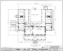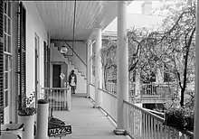 The principal floor was fronted with a full-width porch supported by six Ionic columns set directly under the main roof. This floor contained four rooms, with the central doorway accessing a large parlor from the front porch. The double-leaf central doors featured a finely detailed fanlight and sidelights. An additional entry point from the porch was located to either side of the main doorway in the form of jib window.[2]