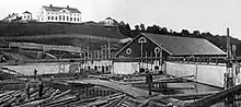 At the beginning of the 19th century, the timber industry began to grow along the Ume River. The original sawmill at Baggböle Rapids, built in 1813-14, stemmed from a partnership between Johan Unander, Eric Nyberg and Johan Vikner, who obtained permission to build there. Development of the industry around Baggböle continued with the arrival of Scottish-Swedish brothers James and Robert Dickson in the 1830s, as a timber market emerged in Great Britain.[7] The Dicksons had built a timber business in the Värmland province but in the 1820s they constructed two large water-powered sawmills. The sawmill at Baggböle was the largest in Sweden powered by water.[8] So infamous were their methods that a new word in Swedish was derived from the name of "Baggböle". The Swedish word baggböleri is a pejorative term for reckless deforestation. The sawmills worked from May to October each year employing 170 workers, excluding women and children.[9]