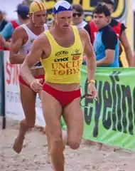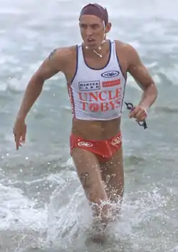 The brainchild of Guy Leech and Trevor Hendy, the survivor was one of the few formats that used the 'typical' IronMan, consisting of three water legs of about three minutes each, plus a short run transition, lasting between 12 and 15 minutes. Survivor started the day with 20 competitors, with the last four to be eliminated each time, until a fifth race consisting of a final four to decide the winner. Due to fatigue, and the cut-throat nature of the races, it was one of the most exciting formats. Because of its race length, it become useful in determining the short course form of many Super Series athletes, who tended not to race in many surf carnivals due to the congested Series schedule. In fact, Guy Andrews won the first Survivor format in 1992/93, and then won his only Australian title that same season. One of the few formats to survive after the Super Series. The Surf League used a two race eliminator format for the IronMan event in 2002/03.[6] A three race eliminator was then used as a series final at Coogee for many years.[7] The five race eliminator made its return at Bondi in December 2010.