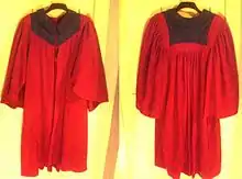 - St Andrews - the gown has a maroon yoke and collar, usually made of velvet to contrast with the woollen fabric of the main gown.