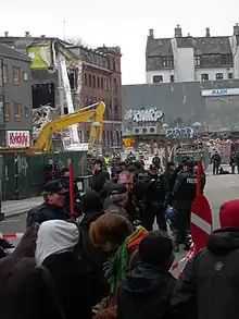 Demolition of Ungdomshuset began at 8 am on 5 March 2007.[1][2] A demolition crane started its work at the back of the house with the top floor. The logos on the crane were covered and workers wore masks to conceal their identity. The union representing Ungdomshuset was on the ground trying to persuade the workers to stop working and reveal the company they were working for. At 10 am the Danish Working Environment Authority (Arbejdstilsynet) had the demolition interrupted due to reported concerns about dust and the potential presence of asbestos. The demolition resumed at 11 am. At 4 pm, about one-third of the house had been removed. The demolition was broadcast live by webcam on TV2 News' website.[1]