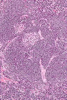 | Micrograph of lymph node biopsy demonstrating hyaline vascular features consistent with Castleman disease | |