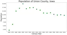 Union County is a county located in the southern part of the U.S. state of Iowa. As of the 2020 Census, the population was 12,138.[1] The county seat is Creston.[2] Organized at a time of tensions before the Civil War, the county was named in 1853 for the union that people wanted to preserve. Union County peaked in population at the 1900 Census. Its economy is based on agriculture and related industries.