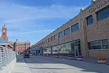 The station was placed on the National Register of Historic Places on July 14, 1982.[2] Beginning in 1984, the facility was renovated and converted from its primary use as a railroad station to a festival marketplace. The Indianapolis architecture firm of Woollen, Molzan and Partners was responsible for the restoration of the station's historic shed, which reopened in 1986.[18] Union Station became a collection of restaurants, nightclubs, and specialty stores that included an NBC Store and a model train retailer. The eastern end of the former train platform area featured a large food court, plus several self-contained bars and nightclubs. Statues of individuals who might have been seen in the railroad station in prior years were installed throughout the facility. The 273-room Crowne Plaza Hotel took up much of the western portion of the train shed, with 26 of its rooms being housed within thirteen old Pullman cars.[19]