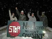 Supporters of the blockade consider the action taken at the Unisʼtotʼen checkpoint and the lack of consultation with hereditary chiefs to be violations of the United Nations' Declaration on the Rights of Indigenous Peoples (UNDRIP).[19][20][21] Many Indigenous peoples have written and discussed the ways this action will impact the Canadian government's efforts to implement the recommendations of the Truth and Reconciliation Commission Report, with many notable Indigenous peoples such as broadcaster Jesse Wente, speaking at rallies and protests.[22][23][24][25]