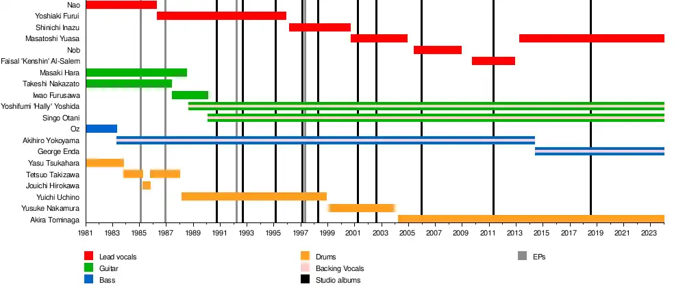 | Past members | Oz Yasu Tsukahara Jouichi "Joe" Hirokawa Kouichi "Nao" Takeshi "Mantas" Nakazato Tetsuo "Tetsu" Takizawa Masaki "Marchan" Hara Iwao Furusawa Yoshiaki Furui Hirokazu Uchino Shinichi Inazu Yusuke Nakamura Nob Faisal "Kenshin" Al-Salem Akihiro Yokoyama |