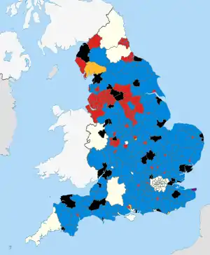 As was the case in the simultaneously-held general election, the Conservative Party was considered the clear winners of the local elections, winning overall control of more than thirty local councils, mostly from councils that before the election had no overall control (i.e., no majority held by any one party).[6] The Conservatives retained control of the Solihull and Trafford councils, the only two metropolitan boroughs that it held before the election, slightly increasing its majority on both.[6] Among the unitary councils, the Conservatives won control of Bath and North East Somerset for the first time.[6]