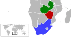![]() Zambia (green), Southern Rhodesia (red), South Africa (blue) | ||