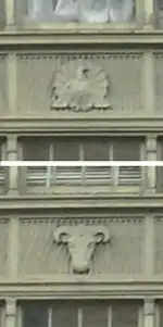 The building is arranged in seven north–south wings, connected at the ends by the Headhouse (facing Independence Avenue) and Tailhouse (facing C Street).[2] The 12th and 14th Street elevations were planned to be seen from the National Mall and so were sheathed in limestone. The C Street and Independence Avenue elevations, which are not visible from the National Mall, used brick as the primary material, with limestone and terra cotta detailing. The 14th Street elevation also features a monumental entrance with sixteen Corinthian columns. Elsewhere, relief panels between windows feature depictions of animals native to the United States by sculptor Edwin Morris.[4]
