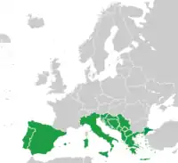 Map of Europe featuring the countries of Southern Europe (highlighted in dark green)