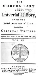 The Universal History (complete title: An Universal history, from the earliest account of time. Compiled from original authors; and illustrated with maps, cuts, notes, &c. With a general index to the whole.[1]) was a 65-volume universal history of the world published in London between 1747 and 1768. Contributors included George Sale, George Psalmanazar, Archibald Bower, George Shelvocke, John Campbell and John Swinton. The novelist Tobias Smollett edited for a short period.[2]