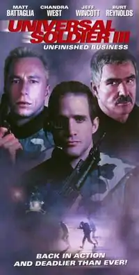 Universal Soldier III: Unfinished Business is a 1998 American made-for-television science fiction film directed by Jeff Woolnough and starring Matt Battaglia, Chandra West, Jeff Wincott, Richard McMillan, and Burt Reynolds. Like Universal Soldier II: Brothers in Arms, none of the actors or crew of the original returned, but most of the cast and crew from the first sequel are present. In 1999, a theatrical sequel starring Jean-Claude Van Damme again, Universal Soldier: The Return, ignored the plotline of the two sequels.