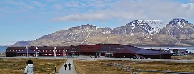The centre was established in 1993 in Longyearbyen, a town of 2,100 inhabitants on the western coast of Spitsbergen island. Despite its name, it is not a university (a status that can only be conferred by the government under certain conditions to larger institutions), but a state-owned enterprise involved in research and some university-level education. The main idea behind establishing UNIS was that the unique geographic location of the island permits the study of Arctic sciences in situ, right outside the company walls. Its official language is Norwegian, but English is used in all tuition and 68% of its 690 students originate from outside Norway (in 2015, foreign students came from 43 countries).[1] The number of students at UNIS was affected by COVID-19 regulations, with 743 students in 2019, 299 students in 2020, and 482 students in 2021, with a corresponding increase of Norwegian students fraction from 32% in 2019 up to 43% in 2020. In 2021 the largest student group came from Norwegian universities (60%), followed by students from Germany (18%) and the Netherlands (10%). The tuition is free of charge and is carried out by 27 full-time professors, 43 adjunct professors, and 160 guest lecturers. The latter are invited from Norwegian and foreign institutions within various joint research projects.[3] Those projects are also instrumental for the enrollment of master and PhD students – UNIS does not accept its own graduates for those courses and requires potential candidates to present a letter of support from their home institution.[4] One important collaboration is the educational exchange program with Russia. The funding for UNIS is provided by the Norwegian government, research councils, and private industry.[1]