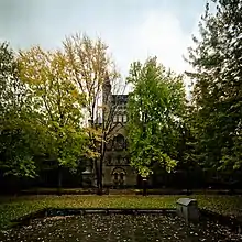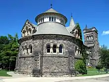 The design committee would eventually include Norman, Romanesque Revival, and "faint traces of Byzantium and the Italian palazzo" styles in the design.[14] In particular, the Byzantine, Norman and early English styles were deemed "fitting for educational institutions".[15] Cumberland chose Norman Romanesque as the main influence because he thought it was the most appreciate for the topography in Canada.[16] To achieve a picturesque approach, Cumberland ignored the classical symmetry and deliberately gave an asymmetrical architectural expression. The building was an unconventional combination of varied parts incorporating British design for educational structures in England and Ireland.