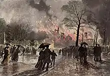 University College was severely damaged by a fire that gutted the entire eastern wing and the college library on 14 February 1890.[3] The fire spread rapidly when servants accidentally dropped two kerosene lamps on a wooden staircase at around 7 p.m. while preparing the illumination for an annual college exhibition.[3] In Ottawa, Edward Blake, the university's chancellor and a Member of Parliament, interrupted his speech to inform the House of Commons, "The great institution, the crown and glory, I may be permitted to say, of the educational institutions in our country is at the moment in flames ... and is now, so far as its material fabric goes, a ruin tottering to the ground."[4] Only about 100 books were rescued before the fire consumed more than 33,000 volumes at the college library. Despite the initial fears, University College recovered from the fire with remarkable ease and speed.[5] Wycliffe College and Knox College both offered space for classes to accommodate displaced students.[6] The board of trustees commissioned a swift restoration of the structure with insurance compensations and additional investments. Within two years, the library was replenished with donations from institutions throughout the British Empire.[6]