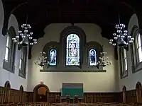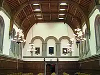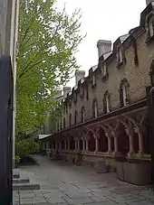 Some of the basic original layout plans remain at University College today. The focal point of the structure is at the south façade, where the stone tower at the centre of the composition contains the main entrance of the college.[16] The quadrangle and cloisters are enclosed within elaborately carved walls faced with stone, "felicitously sited amid landscaped grounds".[18] Until the Laidlaw Wing was completed in the 1960s, University College was a U-shaped structure that was open on the north end. Before the fire of 1890, the building was laid out such that the east wing provided access to the convocation hall, the museum and the library, and contained an entrance to the quadrangle. Residences and dining halls, classrooms, and public reading rooms were on the west range of the structure. The chemistry laboratory was relocated at the southwest range, in the present Croft Chapter House, because it was more logical than in the first study which was in the north. Today, the west wing is no longer used as living quarters, which are now provided by the college's three dedicated residential halls, while the convocation functions have long since been moved to Convocation Hall.
